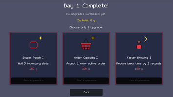 - Progression: upgrades between days (brew speed, more orders, bigger inventory, better tips, rush bonus)